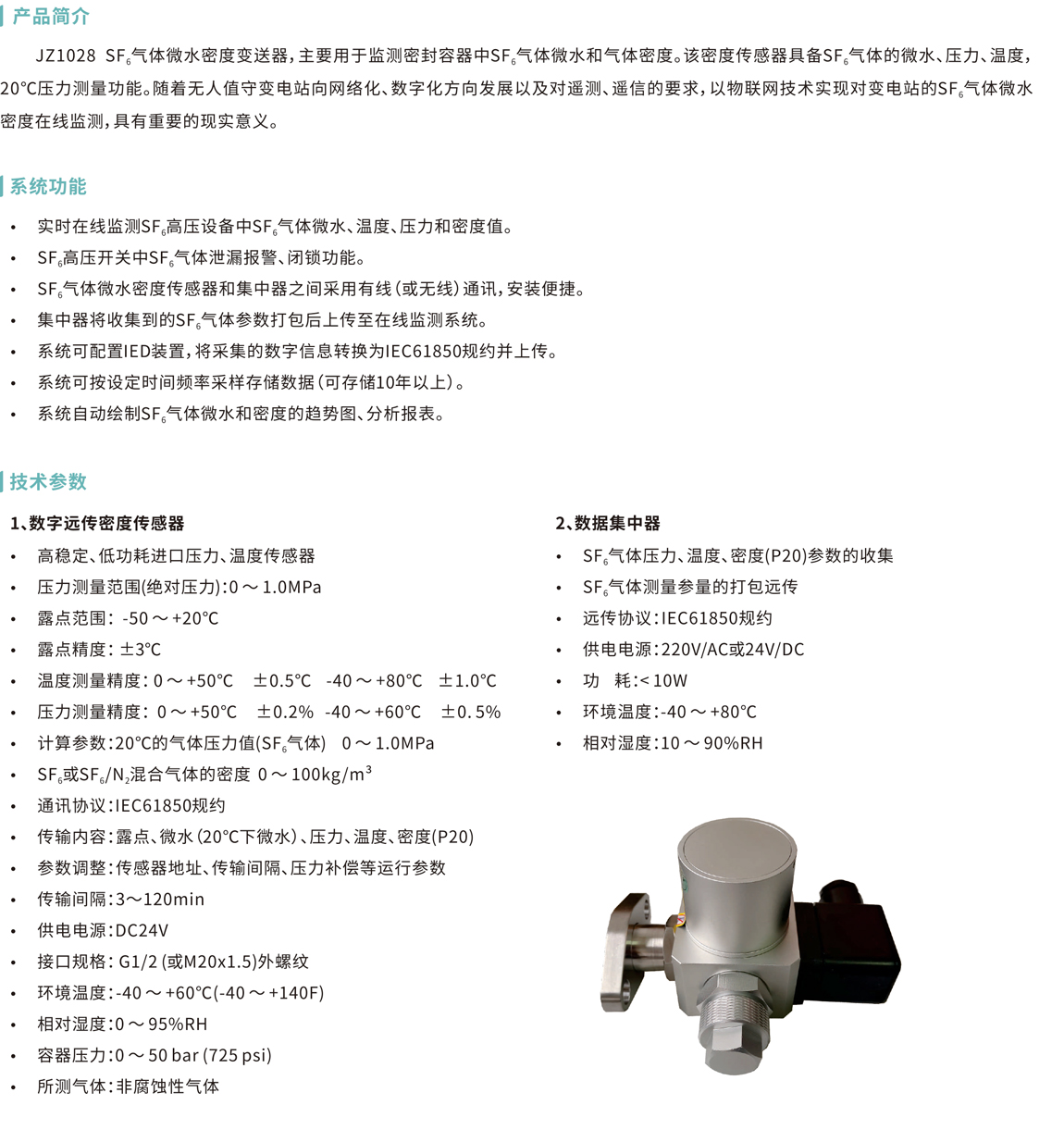 JZ1028SF6氣體微水密度變送器,主要用于監測密封容器中SF6氣體微水和氣體密度。該密度傳感器具備SF6氣體的微水、壓力、溫度,20°℃壓力測量功能。隨著無人值守變電站向網絡化、數字化方向發展以及對遙測、遙信的要求,以物聯網技術實現對變電站的SF6氣體微水密度在線監測,具有重要的現實意義。