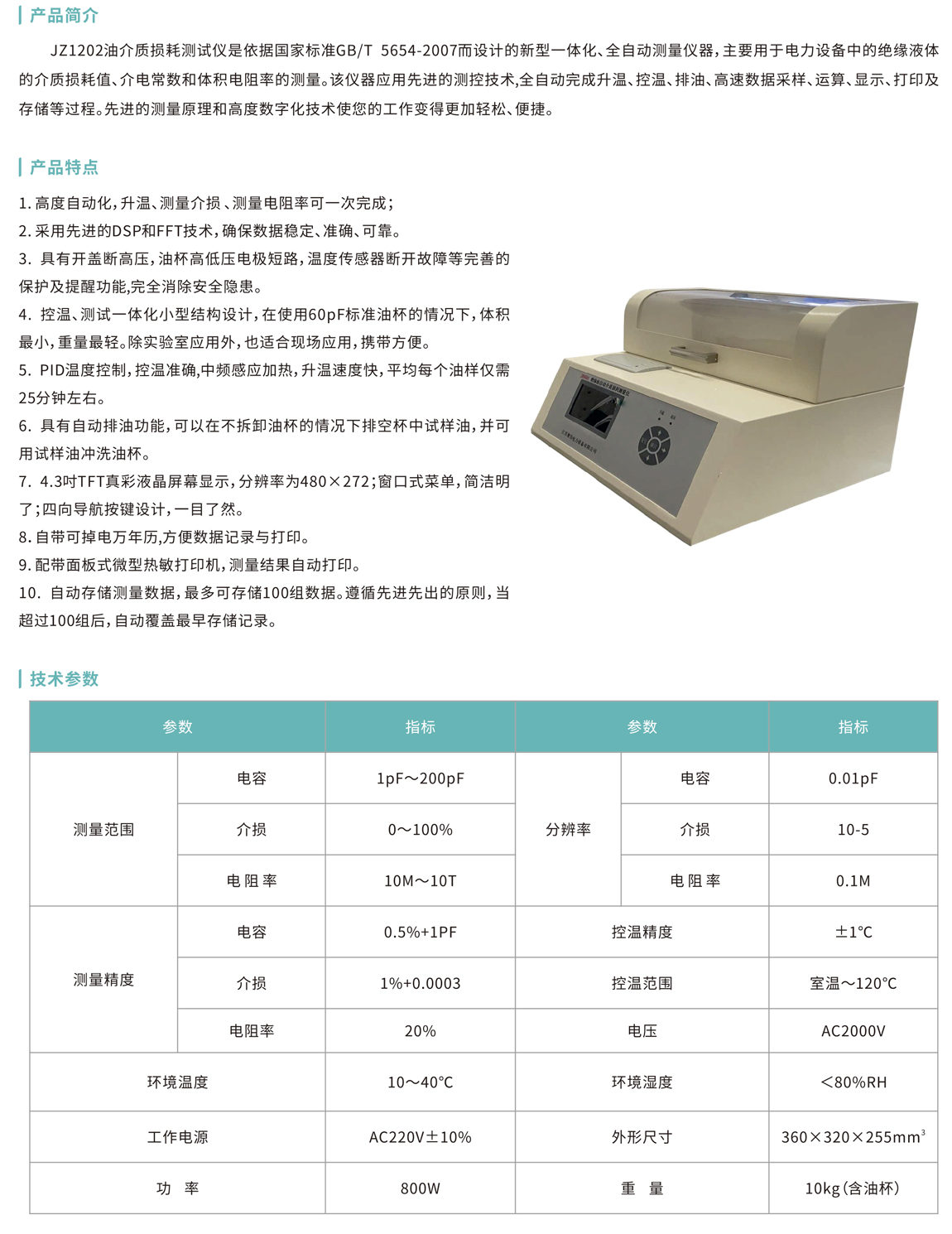 JZ1202油介質損耗測試儀是依據國家標準GB/T5654-2007而設計的新型一體化、全自動測量儀器,主要用于電力設備中的絕緣液體 的介質損耗值、介電常數和體積電阻率的測量。該儀器應用先進的測控技術,全自動完成升溫、控溫、排油、高速數據采樣、運算、顯示、打印及 存儲等過程。先進的測量原理和高度數字化技術使您的工作變得更加輕松、便捷。