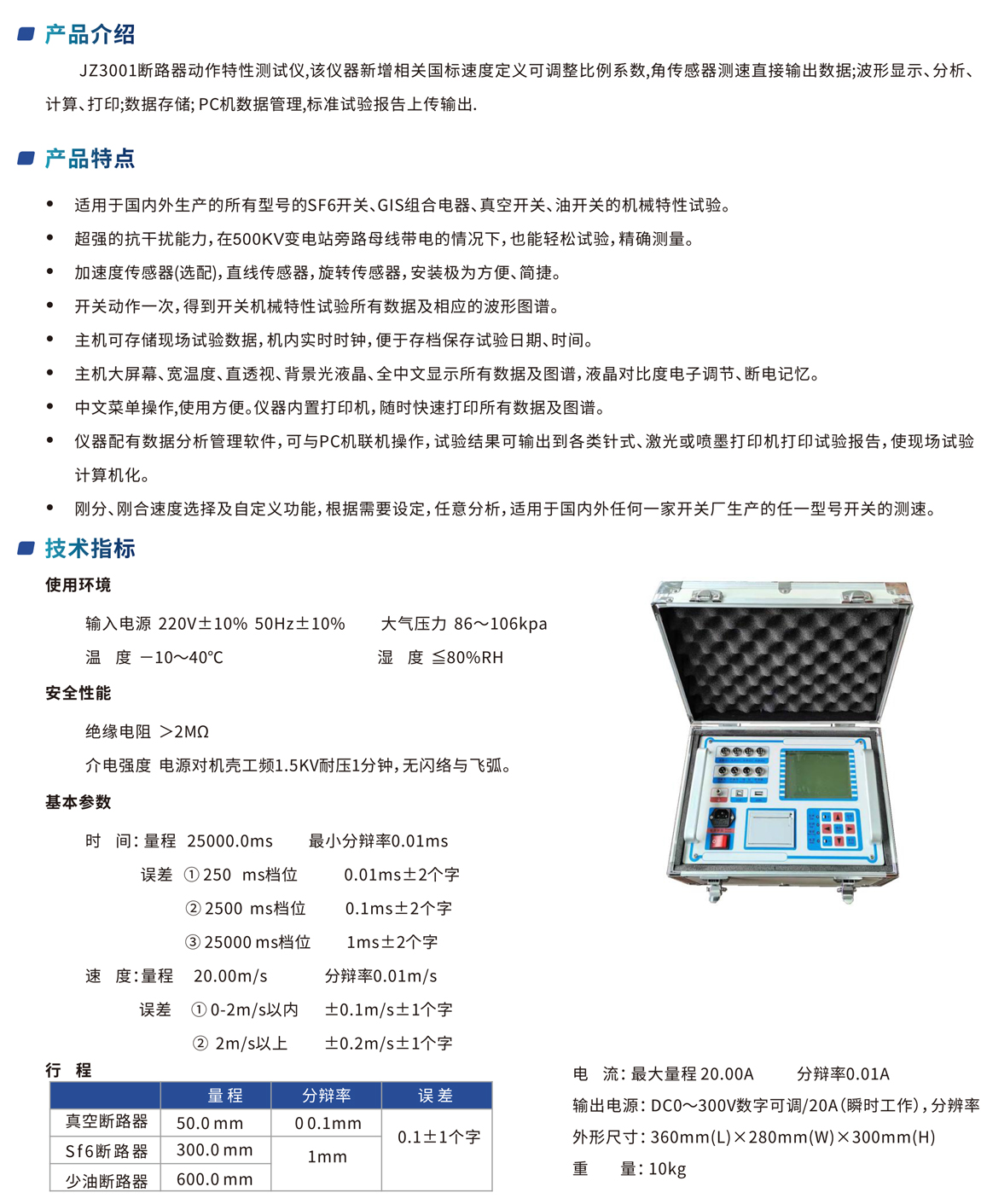 JZ3001斷路器動作特性測試儀,該儀器新增相關國標速度定義可調整比例系數,角傳感器測速直接輸出數據;波形顯示、分析、 計算、打?。粩祿鎯?;PC機數據管理,標準試驗報告上傳輸出.